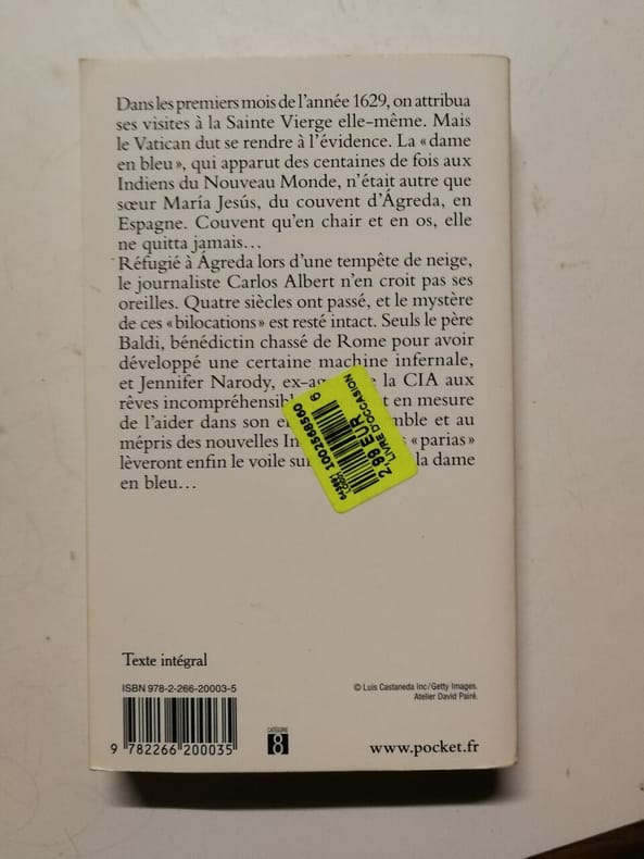 Pocket Sans date. Le roman de Javier Sierra explore la légende de la 'Dame en bleu' une religieuse espagnole nommée sœur Maria Jesús d'Ágreda qui aurait évangélisé des peuples indigènes du Nouveau Monde sans jamais quitter physiquement son couvent. L'auteur transforme cette énigme historique en une enquête fantastique qui traverse quatre siècles d'histoire et de mystères