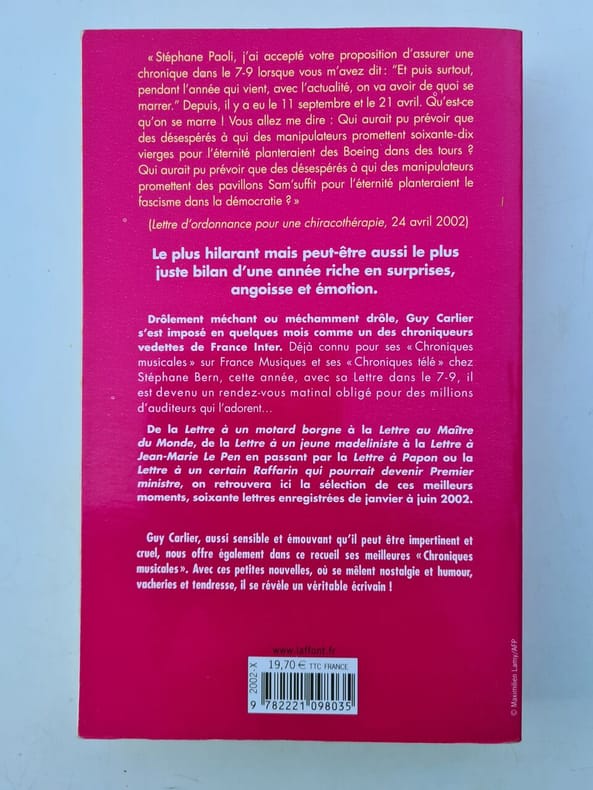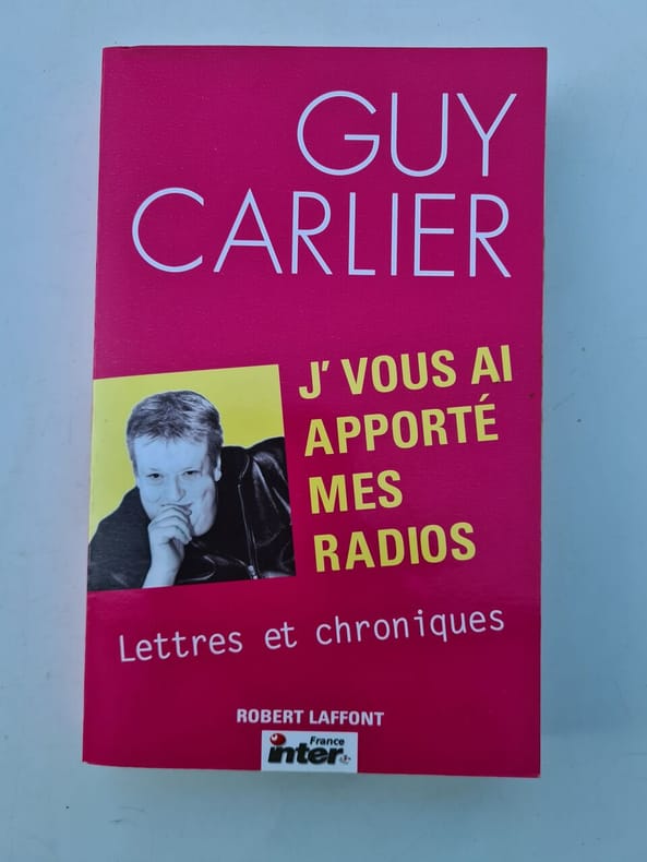 Robert Laffont Sans date. Ce livre rassemble les chroniques radiophoniques humoristiques de Guy Carlier notamment sa célèbre 'Lettre' diffusée sur France Inter ainsi que ses chroniques musicales. Il s'agit d'une compilation de textes satiriques revisitant l'actualité qui a contribué à faire de l'auteur une figure populaire de la radio française