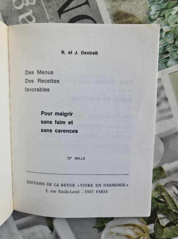 Vivre en Harmonie Sans date. Ce livre propose des menus et des recettes conçus pour faciliter la perte de poids sans sensation de faim ni carences nutritionnelles dans une approche liée à la naturopathie et à l'hygiénisme