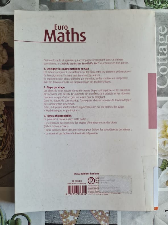 Hatier Sans date. Euro Maths CM1 est un manuel scolaire de mathématiques pour le niveau CM1 conforme aux programmes 2008 avec une progression organisée en 5 périodes de 6 à 7 semaines. Le livre du professeur associé sert à la fois d'outil pédagogique pour le travail quotidien et de support d'auto-formation