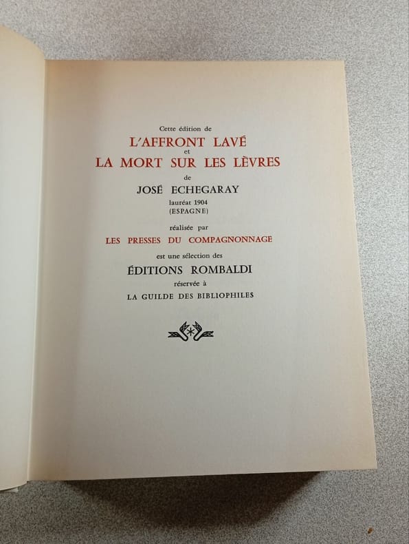 Académie Suédoise - Fondation Nobel, 1960. Sélection des Editions Rombaldi, Réservée à La Guilde des Bibliophiles. Coll. des "Prix Nobel de Littérature". In-8 cartonné blanc, dessin original de Picasso en couverture, 418 p. Avec "Petite histoire" de l'attribution du Prix Nobel, discours de réception, vie et oeuvre de l'auteur, ... bibliographie. Illustration en couleurs par Grau-Sala. Portrait de l'auteur et ornements typographiques par Michel Cauvet. Très bon état.Coll. "Prix Nobel de Littérature". Lauréat 1904, Espagne.