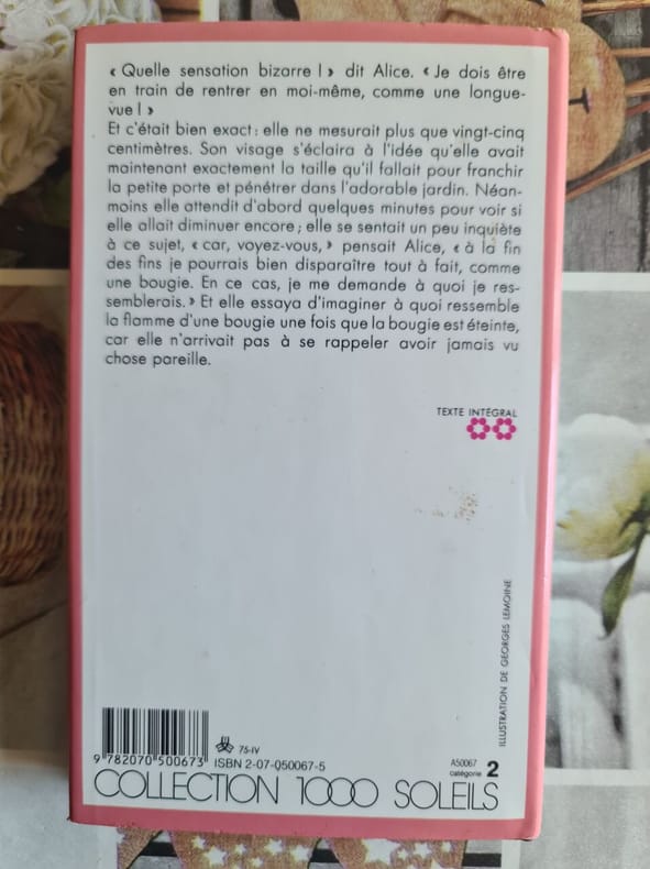 Cahier de 24 planches hors-texte de dessins tirés de l'édition anglaise, en noir et blanc (complet) 1ere édition dans cette collection bilingue en poche, 1970 Contents, Chapitres : Chronologie, préface et bibliographie - Texte anglais avec sa traduction française en juxtalinéaire - Les Aventures d'Alice au pays des merveilles (titre original : Alice's Adventures in Wonderland), fréquemment abrégé en Alice au pays des merveilles, est un roman écrit en 1865 par Lewis Carroll, nom de plume de Charles Lutwidge Dodgson. Le livre a été traduit en français pour la première fois en 1869 par la même maison d'édition (Macmillan and Co). À l'origine, lors de sa première écriture, le livre n'était pas destiné aux enfants. L'écriture fut reprise une seconde fois pour les enfants en conservant les personnages merveilleux qui la rendaient si attrayante pour ce jeune public. Le roman foisonne d'allusions satiriques aux amis de l'écrivain et aux leçons que les écoliers britanniques devaient mémoriser à l'époque. Le pays des merveilles, tel qu'il est décrit dans le conte, joue sans cesse avec la logique. Le livre a connu une suite intitulée De l'autre côté du miroir. Les adaptations cinématographiques combinent souvent des éléments des deux livres. De nos jours, l'ouvrage reste populaire aussi bien auprès des enfants que des adultes. L'écrivain américain Martin Gardner a publié The Annotated Alice (non traduit en français) qui regroupe Alice au pays des merveilles et De l'autre côté du miroir accompagnés des poèmes victoriens que Lewis Carroll parodia dans le corps du texte. (source : Wikipedia) couverture un peu jaunie, avec une infime trace de pliure au coin inférieur du plat supérieur, sinon bon état, intérieur frais et propre mais avec 2 signatures et une date sur la première page, texte propre, bien complet des 24 planches reproduisant les dessins originaux en noir - format de poche