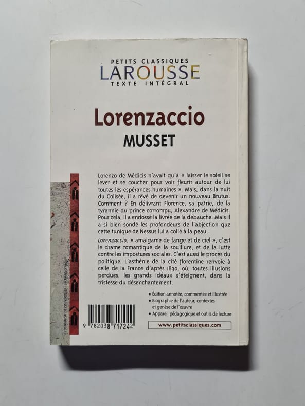 Larousse Sans date. Lorenzaccio est un drame en cinq actes et en prose d'Alfred de Musset publié en 1834 et inspiré d'une chronique de la Renaissance. Il raconte l'histoire romancée de Lorenzo de Médicis qui assassine son cousin tyrannique Alexandre de Médicis dans l'espoir de libérer Florence mais dont l'acte ne déclenche pas la révolution espérée conduisant à sa propre mort et au remplacement immédiat du tyran