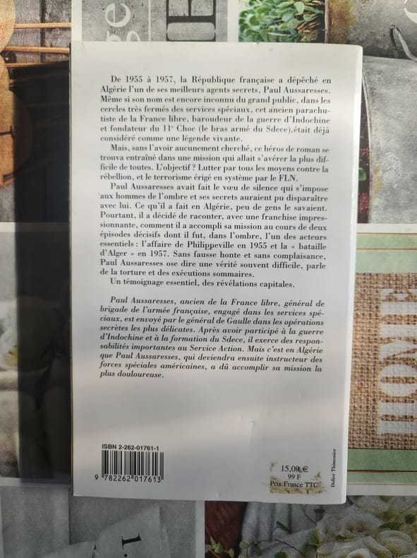 Aucune guerre n'est réellement propre, l'armée française et le F.L.N. se sont livrés une lutte sanglante où la repression, parfois dure et brutale, a répondu au terrorisme érigé en système par le F.L.N. L'apogée en fut, sans doute, la Bataille d'Alger. L'auteur, qui revendique une bonne part des actions dures, nous livre une partie de ses secrets. Les révélations de l'auteur de ce livre ont fait grand bruit mais le général Aussaresses comme une grande partie des faits qu'il raconte sont contestés par d'autres acteurs de ce drame, les colonel Godard et Argoud par exemple. Ce témoignage n'est donc pas une vérité historique, il est tout au moins le témoignage d'un des acteurs qui devra passer, quand les passions se seront appaisées, au crible de la critique historique.