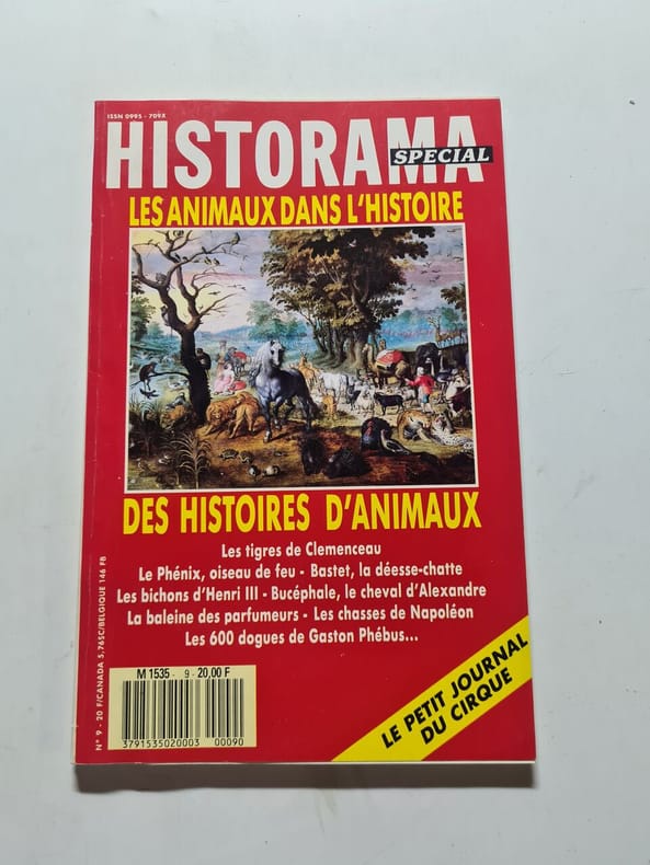 Les animaux dans l'histoire, des histoires d'animaux - les tigres de clemenceau, le phenix oiseau de feu, bastet la deesse chatte, les bichons d'henri III, bucephale le cheval d'alexandre, la baleine des parfumeurs, les chasses de napoleon, les 600 dogues de gaston phebus , Courtisans à quatre pattes - le chat dans tous ses états - à cheval - les oiseaux de l'étrange - ils ont changé la civilisation - laissez pisser le mérinos - elle souffle la baleine - un bestiaire fantastique - venins et morsures - les saboteurs de l'ombre - peste soit du rat - la huitième plaie d'Egypte etc. Classification Dewey : 70.49-Presse illustrée, magazines, revues