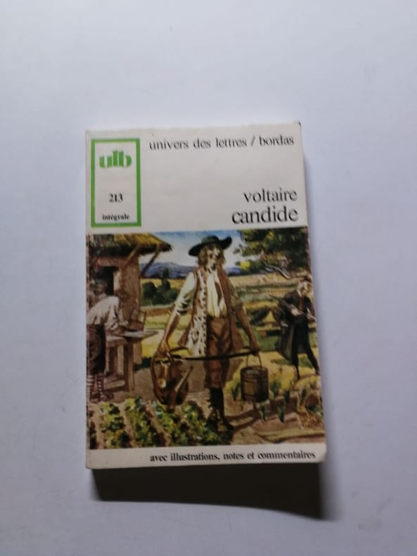 préface de Francisque Sarcey, illustrations de Adrien Moreau Candide est un conte philosophique. Il a pour personnage principal un jeune homme, Candide, qui vit dans un château avec sa cousine, Cunégonde, et son oncle. Il y est éduqué par un précepteur philosophe, Pangloss, qui suit la théorie de Leibniz, philosophe du XVIIe siècle, selon laquelle, notamment, « tout est pour le mieux dans le meilleur des mondes possibles ». Candide adhère d’abord à cette idée ; mais lorsque son oncle le chasse du château après l’avoir surpris en train d’embrasser Cunégonde, la vie va lui faire revoir cette opinion. Candide va en effet traverser une série de péripéties qui seront autant d’épreuves. Il se bat contre les Abares et découvre les horreurs de la guerre ; il assiste à la mort de milliers d’hommes et de femmes lors du tremblement de terre de Lisbonne ; il est condamné à mort injustement et en réchappe comme par miracle ; il découvre la manière cruelle dont sont traités les esclaves noirs, et finit par se réfugier en Turquie. Sur son chemin, il perd et retrouve tour à tour Pangloss et Cunégonde. A la fin du conte, ils vivent tous ensemble en Turquie et se contentent de « cultiver leur jardin », c’est-à-dire de s’occuper de leurs affaires privées sans plus se mêler du monde. « Il faut cultiver son jardin » est en effet le mot final du derviche, un mystique et sage de confession musulmane. Les principaux thèmes de cette œuvre sont ainsi le bonheur, la justice, l’ordre du monde et la politique. volume in-4, 255x170, jolie reliure, dos à nerfs, tranches de tête dorée, bel état intérieur, 174pp, couvertures d'origines conservées, coins lg. frottés, état intérieur neuf. Paris Jules Tallandier ( collection, " Les chefs d’œuvres de l'esprit " ), sans date, vers 1900 ref/241