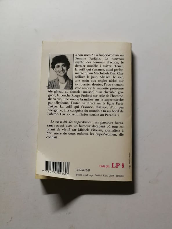 Le Livre de Poche 1997 221 pages poche. 1997. Broché. 221 pages. Imprimer la fiche ISBN : 9782253046646 Résumé : « Son nom? La SuperWoman ou Femme Parfaite. Le nouveau mythe des femmes d'action " le dernier modèle à suivre. Tenez " la voilà qui s'avance " aussi performante qu'un MacIntosh Plus " Chanellisée le jour " Alaïsée le soir " une main aux ongles nickel sur son dernier dossier " l'autre tenant avec amour la menotte poisseuse (de gâteau au chocolat maison) d'un chérubin grognon " la bouche Rouge Profond sur celle de l'homme de sa vie " une oreille branchée sur le supermarché par téléphone " l'autre en direct sur la ligne ParisTokyo. La voilà qui s'avance " disais je " d'un pas énergique " à la conquête du monde. Ou au bord de l'abîme. Car souvent l'Enfer touche au Paradis. » Le ras-le-bol des SuperWomen : un parcours harassant retracé avec un humour décapant où tout est criant de vérité car Michèle Fitoussi " journaliste à Elle " mère de deux enfants " les SuperWomen " elle connaît