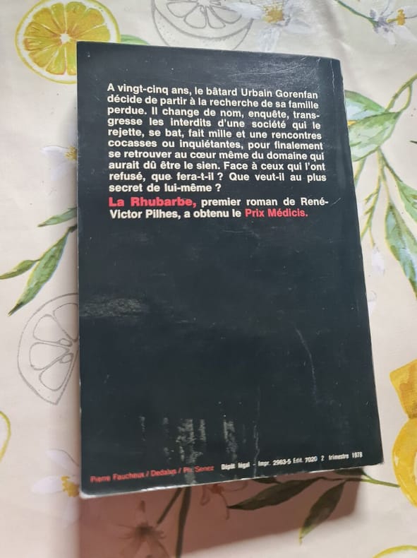 Le Livre de Poche Sans date. Roman de René-Victor Pilhes publié en 1965 aux éditions du Seuil qui a reçu le prix Médicis la même année. L'ouvrage est structuré en trois parties distinctes : L'Urbain L'Aubain et Le Paladin