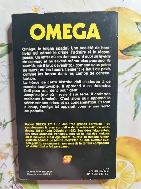 Presses Pocket Sans date. Oméga est un ouvrage de science-fiction de Robert Sheckley présenté comme une sorte de paradis pour le personnage principal. L'auteur considéré comme l'un des grands écrivains américains du genre est réputé pour ses idées fulgurantes et son style corrosif et ironique