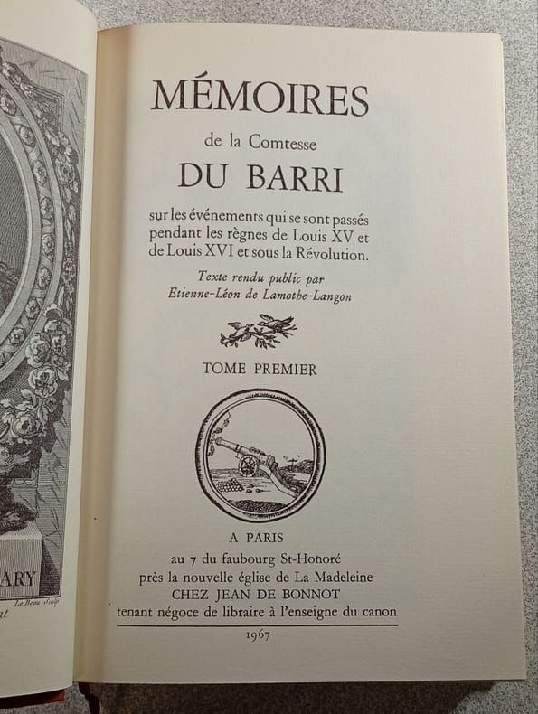 1967, chez Jean de Bonnot, 2 volumes in-8 de 362 et 408 pages, reliures plein cuir d'éditeur, dorures, deux premiers tomes (sur 5) des mémoires de la Comtesse du Barri sur les évènements qui se sont passés pendant les règnes de Louis XV et de Louis XVI et sous la révolution. texte rendu public par Etienne-Léon de Lamothe-Langon | Etat : Bon état général, haut du 1er volume légèrement déformé (Ref.: ref97006)