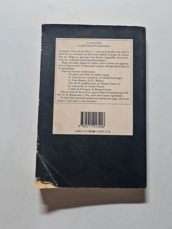 Le train perdu et autres histoires mystérieuses - Sophie Catala : Un gentil petit bled, Michel Carrouges : Le cache nez de caoutchouc, J.G. Ballard : Le vinci disparu, Thomas Owen : Une aile de papillon mort, Claude Farrere : Le train perdu, Bernard Cassac : L'arbre du portugais /// Serge Hochain (Illustrations), Christian Poslaniec Classification Dewey : 840.091-XX ème siècle