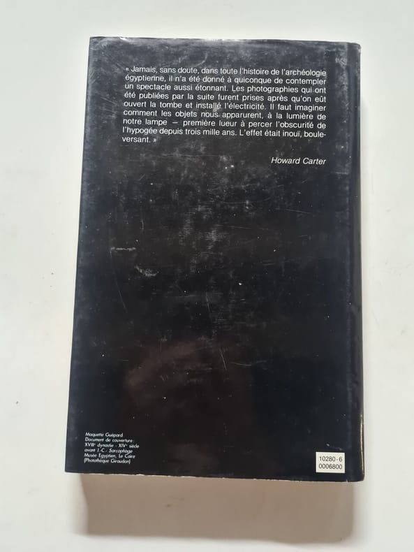 """5 novembre 1922, l'auteur découvre le sarcophage royal"". Traduit de l'anglais par Wiznitzer Martine. Classification Dewey : 962-Egypte et Soudan"
