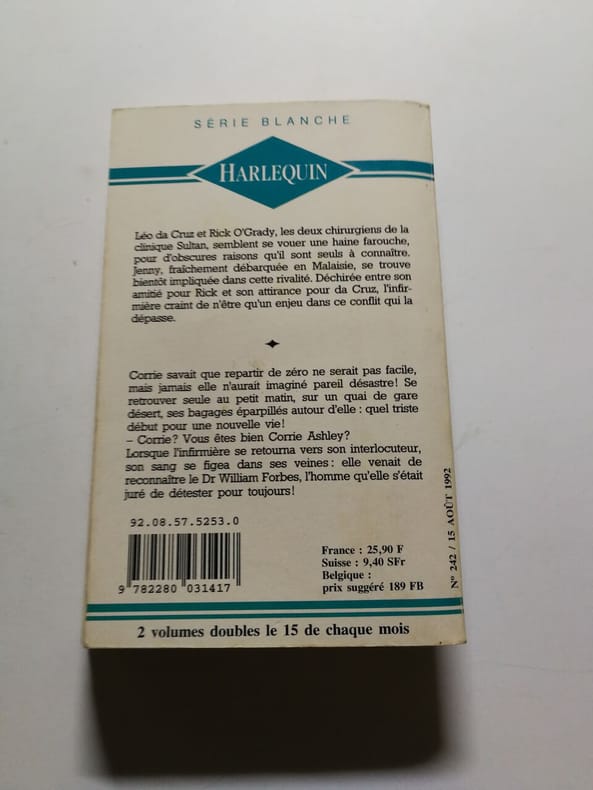 COLLECTION HARLEQUIN SERIE BLANCHE N° 242. 1992. In-12. Broché. Etat d'usage, Couv. convenable, Dos satisfaisant, Intérieur frais. 309 pages. Numéro double.. . . . Classification Dewey : 820-Littératures anglaise et anglo-saxonne