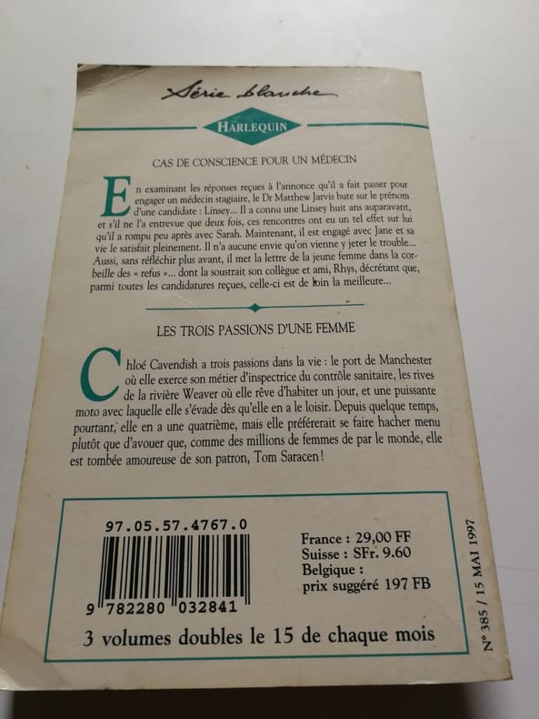 COLLECTION HARLEQUIN SERIE BLANCHE N° 385. 1997. In-12. Broché. Bon état, Couv. convenable, Dos satisfaisant, Intérieur frais. 311 pages. Numéro double.. . . . Classification Dewey : 820-Littératures anglaise et anglo-saxonne