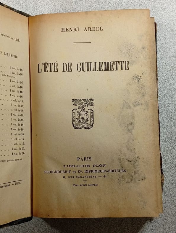 Paris Librairie Plon. Plon, Nourrit et Cie, Imprimeurs-Editeurs 1921 in 12 (19x12) 1 volume broché, 314 pages [1]. Henri Ardel, pseudonyme de Berthe Abraham, 1863-1935, écrivaine française. Bel exemplaire