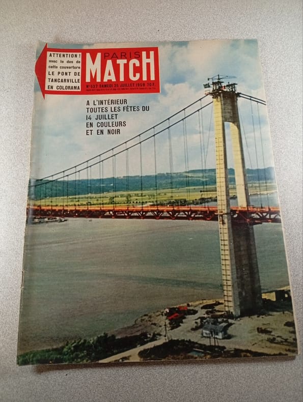 72 PAGES-26,5 CM X 35 CM-EN COUVERTURE AVEC LE DOS DE CETTE COUVERTURE LE PONT DE TANCARVILLE EN COLORAMA"-LE PONT DE TANCARVILLE ATTRACTION NATIONALE 33 MILLIONS EN 13 JOURS-PARIS-LONDRES 50 ANS APRES LES JETS DANS LE CIEL DE M. BLERIOT-14 JUILLET 1959 80 MILLIONS D'HOMMES SOUS UN DRAPEAU-DESSIN SAVIGNAC POUR PUBLICITE "MOBIL"-DE GAULLE ENTRAINE LA FETE VERS LES JARDINS DE L'ELYSEE-MORT D'UN CLOWN, GROCK-L'ESPAGNOL ORGUEILLEUX AVAIT DIT: "JE GAGNERAI", LE GRAND BOBET VAINCU A DIT ADIEU AU TOUR, L'AIGLE DE TOLEDE DORT AVEC SON VELO