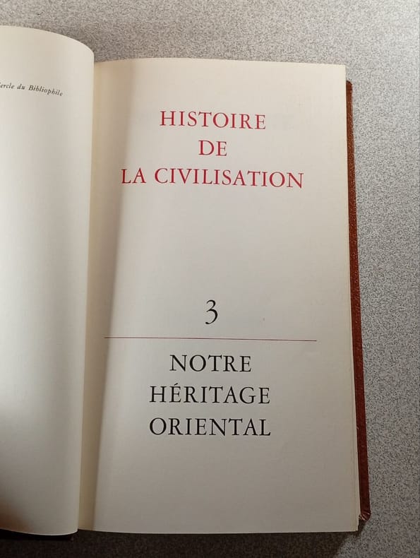 Cercle du bibliophile 1970 in8. 1970. Cartonné. 11 volume(s). Histoire de la civilisation volumes 1 à 1: Notre héritage oriental (1-2-3): Les origines Sumer l'Egypte La babylonie L'Assyrie La judée La perse L'inde La Chine Le Japon La vie de la Grèce (4-5-6): Le monde Egéen La Grèce archaïque L'âge d'or Déclin et ruine de la liberté César et le christ (7-8-9): Rome les origines la république Rome le principat L'empire la jeunesse du christianisme L'age de la foi (10-11): L'apogée de Byzance La civilisation islamique la civilisation judaïque l'âge des ténèbres ---- illustré en couleurs et noir et blanc