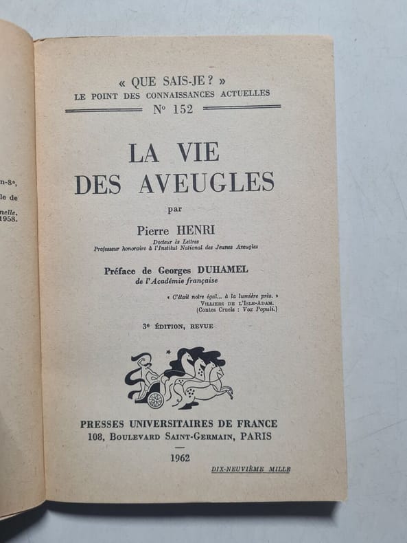 Presses Universitaires de France Sans date. Il s'agit d'une analyse de la vie et de l'œuvre de Louis Braille l'inventeur de l'alphabet pour les aveugles couvrant la période 1809-1852. Le livre explore également plus largement la vie des personnes aveugles comme en témoigne une autre édition intitulée 'La Vie des aveugles'