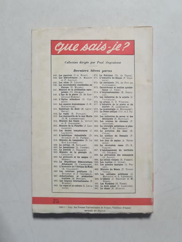 Titre imprimé en noir, fond vert, bandeau jaune ; 128pp ; Préface de Georges Duhamel ; 4ème édition mise à jour, 26e mille ; N°152 de la collection "Que sais-je ?", frottements à la couverture