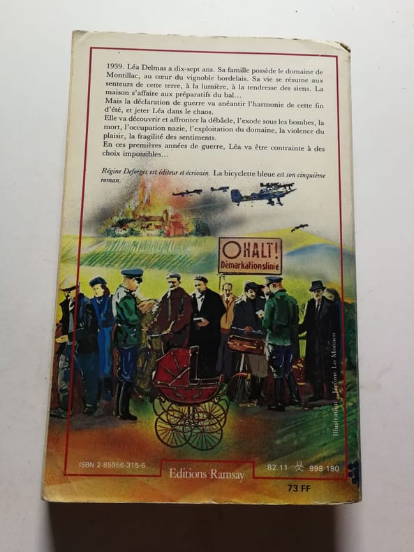 Editions Ramsay Sans date. La Bicyclette bleue est le premier tome d'une trilogie historique de Régine Deforges publié en 1981. L'action se déroule pendant l'occupation allemande de la France. Le roman mêle intrigue historique et romance