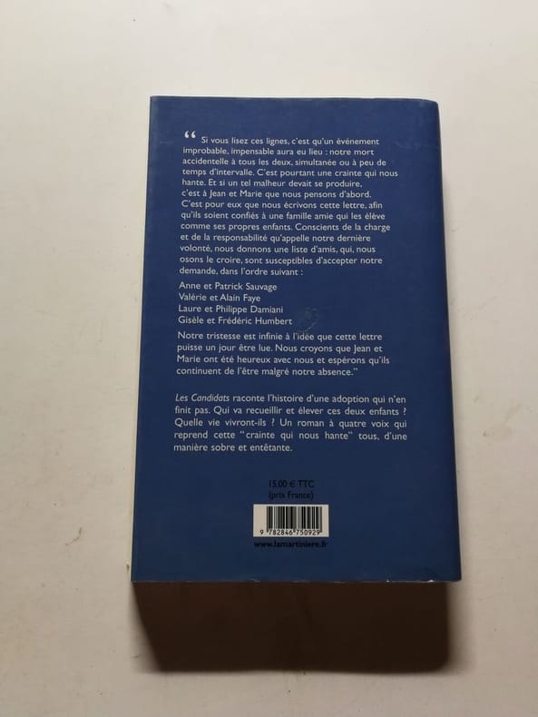 Editions de La Martinière 2026 236 pages in8. 2026. Broché. 236 pages. Jean et Marie ont perdu leurs parents dans un accident de voiture. Parce qu'ils avaient imaginé l'impensable leur possible disparition ces derniers ont laissé un testament. Dans leur dernière lettre ils désignent les un après les autres quatre couples d'amis à qui ils demandent d'élever leurs enfants. Les Candidats raconte l'histoire d'une adoption qui n'en finit pas. Qui finira par recueillir ces deux enfants ? Quelle sera leur vie ? Un roman à quatre voix qui reprend " cette crainte qui nous hante tous " d'une manière sobre et entêtante