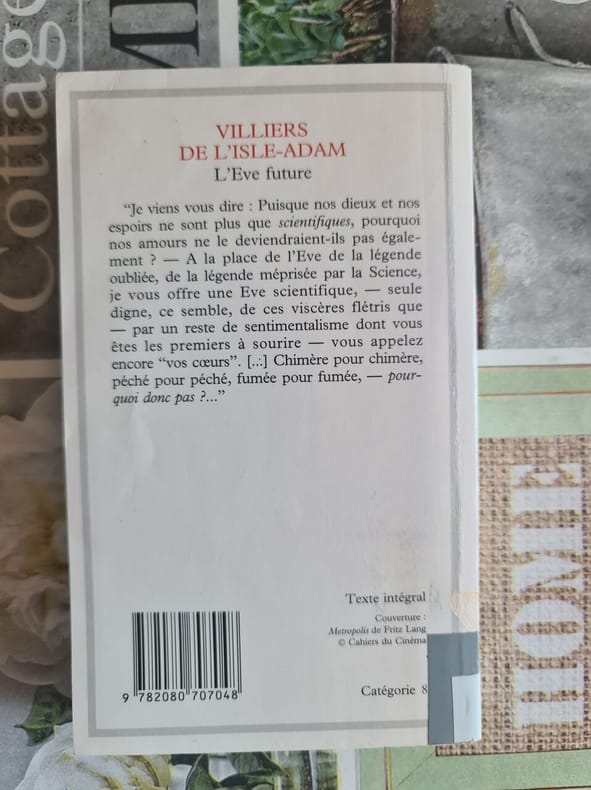 GF-Flammarion Sans date. L'Ève future est un roman de Villiers de l'Isle-Adam publié en 1886 considéré comme une œuvre fondatrice de la science-fiction. Il explore le dilemme entre l'être et le paraître à travers la création d'un robot à visage humain posant la question de savoir si l'amour peut devenir scientifique