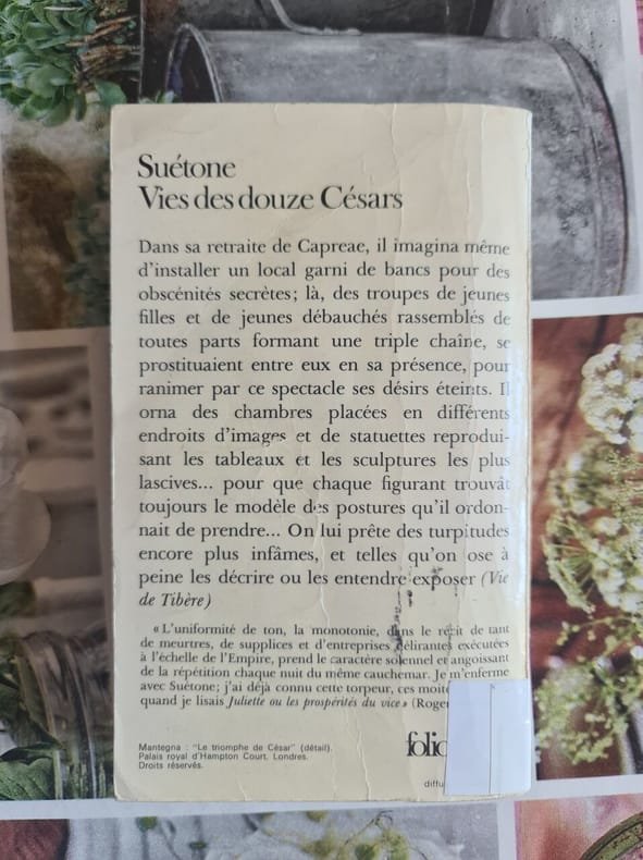 Folio Sans date. Les 'Vies des douze Césars' de Suétone écrites vers 120 après J.-C. constituent un recueil de biographies des douze premiers empereurs romains de Jules César à Domitien. L'ouvrage présente des portraits complexes et détaillés de ces figures historiques explorant à la fois leur vie publique et privée avec un regard incisif sur la Rome impériale