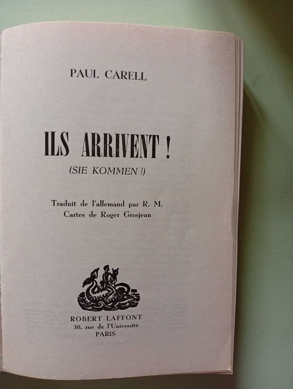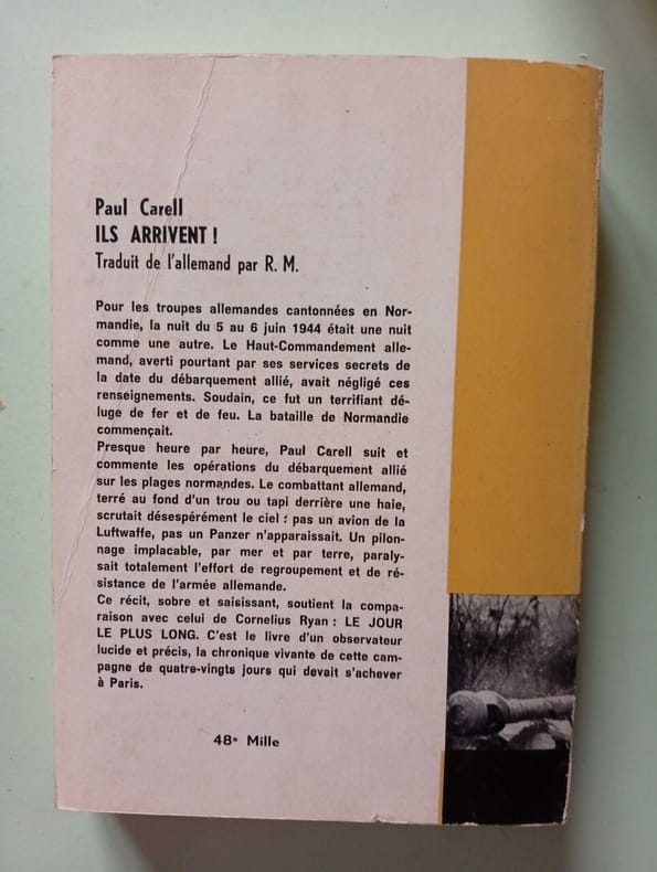 Robert Laffont 1961 1961. Le livre "Ils arrivent !" (titre original "Sie kommen !") de Paul Carell publié en 1960 relate le début du débarquement allié en Normandie le 6 juin 1944 jusqu'à la libération de Paris vu du côté allemand. L'auteur décrit heure par heure les opérations militaires telles qu'elles furent vécues par les troupes allemandes de la bataille de Tilly à la percée de Saint-Lô en mettant en lumière le combat d'une armée confrontée à une supériorité numérique et technique écrasante