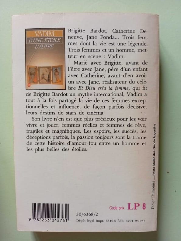 LGF/Le Livre de Poche 1992 11x2 4x16 4cm. 1992. mass_market. Dans ce livre le réalisateur Roger Vadim raconte ses relations amoureuses et professionnelles avec trois actrices légendaires du cinéma français : Brigitte Bardot Catherine Deneuve et Jane Fonda. Il évoque les espoirs les succès les déceptions et la passion qui ont tissé cette "histoire d'amour fou" entre un homme et ces étoiles offrant un témoignage précieux sur leur vie réelle et de rêve