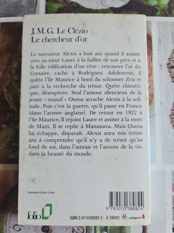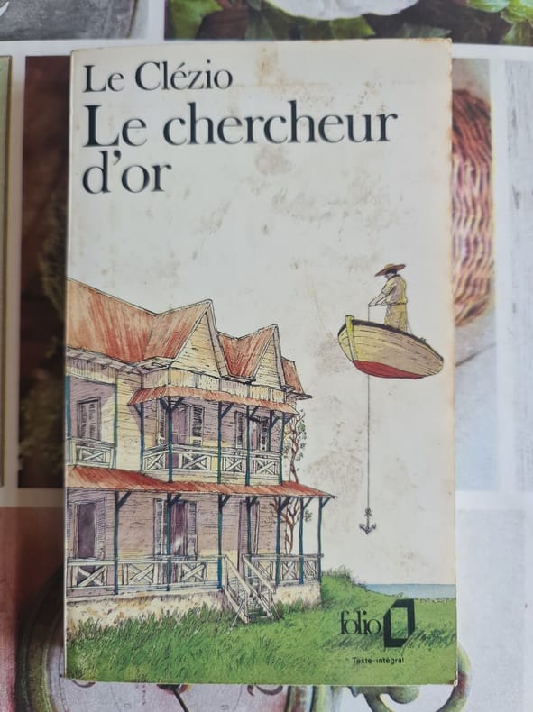 Inspirée par l'aventure du grand-père paternel de l'auteur, Léon Le Clézio, l'histoire du Chercheur d'or a pour cadre les îles Maurice et Rodrigues. Chassés de leur domaine du Boucan par la faillite et un cyclone, le narrateur, Alexis L'Étang, n'a plus qu'un désir : réaliser le rêve de son père en retrouvant le trésor d'un corsaire caché à l'île Rodrigues, évoquant l'achipel de Saint-Brandon, « un paradis sur terre » où les pirates venaient se réfugier pour mourir au XVIIIe siècle. « Le Chercheur d'or est un roman d'aventure et d'initiation qui s'apparente à L'Île au trésor de Stevenson où Jim, le héros, prend la mer pour découvrir un trésor enfoui sur une île. L'initiation commence par la rupture avec l'univers de l'enfance (...) et convoque plusieurs mythes littéraires, dont celui de Paul et Virginie ou de Robinson Crusoe, (...) en quête d'une vérité spirituelle et à une harmonie intérieure devant la beauté du monde. » (B. Chahine, Dictionnaire Le Clézio) « La littérature est une forme d'aventure, dont on ne connaît ni la fin ni l'issue mais que l'on peut prolonger, faire déraper, en écrivant. (...). Mon grand-père, le trésor, il ne l'a jamais trouvé, il l'a dit dans une des lettres, mais il a tout remis dans l'état où c'était pour que quelqu'un d'autre prenne la relève. C'était un rêveur, mais un rêveur minutieux, en laissant un plan très détaillé d'un monde qui n'existe pas » (entretien avec Augustin Trapenard, 21 cm, 2018). Légère trace d'insolation en marge haute des premiers feuillets (sur 3 mm).