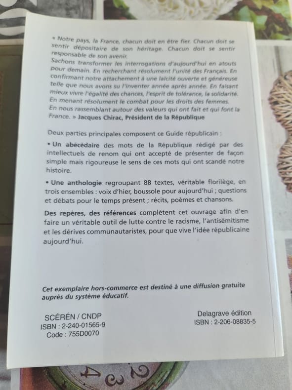 Delagrave Sans date. Le 'Guide républicain' est un ouvrage collectif dirigé par Mohammed Arkoun et publié par le Ministère de l'Éducation nationale. Il constitue un outil pédagogique pour promouvoir les valeurs républicaines et lutter contre le racisme l'antisémitisme et les dérives communautaristes. L'ouvrage rassemble des textes de personnalités reconnues sur les concepts clés de la République