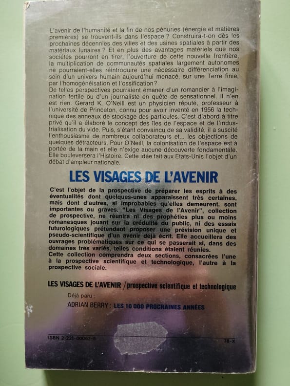Robert Laffont Sans date. Broché. Le livre 'Les Villes de l'espace' de Gerard K. O'Neill est un essai de prospective scientifique qui défend l'idée que la colonisation de l'espace par l'humanité est réalisable à court terme sans nécessiter de découverte fondamentale majeure. L'auteur physicien américain y expose son projet de construction de grandes colonies spatiales habitées (comme les cylindres O'Neill) et d'industrialisation de l'espace présentant cette entreprise comme une solution aux pénuries terrestres et un bouleversement historique
