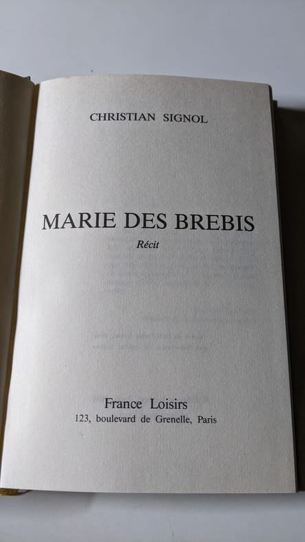 France Loisirs Sans date. Marie des Brebis est un récit de vie raconté par une bergère centenaire Marie qui confie son histoire à l'écrivain Christian Signol. Trouvée enfant parmi les brebis en 1901 par le vieux pâtre Johannes elle partage avec simplicité les événements tristes ou joyeux de son existence pastorale dans les Causses
