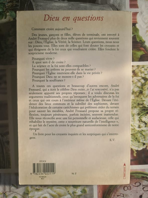 Desclée de brouwer 1990 221 pages 22x15x5cm. 1990. broché. 221 pages. André Frossard répond dans ce livre à plus de deux mille questions posées par des élèves de terminale sur des thèmes comme Dieu l'Église la Vérité et la Science. L'ouvrage aborde la question de la croyance aujourd'hui à travers ce dialogue avec les jeunes
