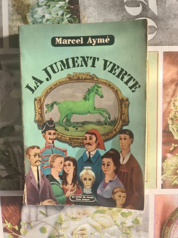 Le Livre de Poche Sans date. La Jument verte de Marcel Aymé est un roman humoristique et satirique où une jument morte continue d'intervenir dans l'intrigue à travers un tableau hérité par le personnage Ferdinand. Elle résume et développe les situations par son analyse offrant une critique sociale riche et irrésistiblement drôle