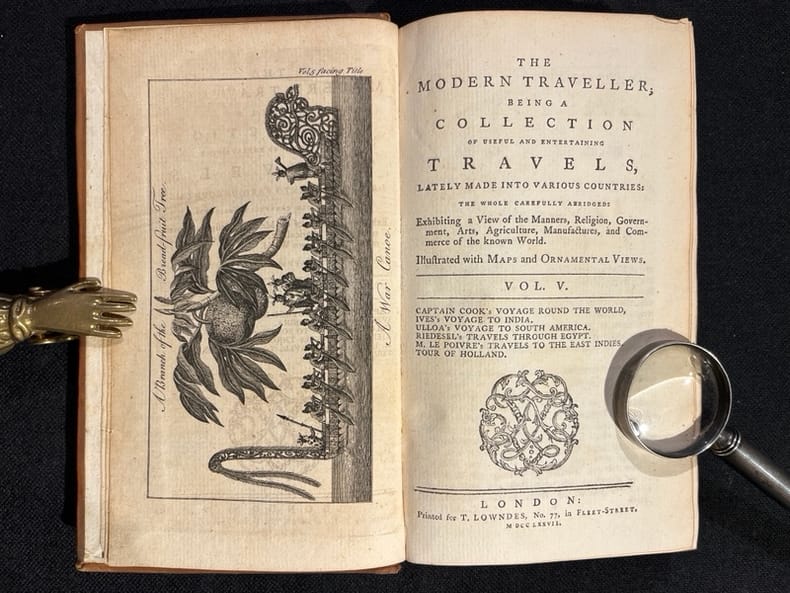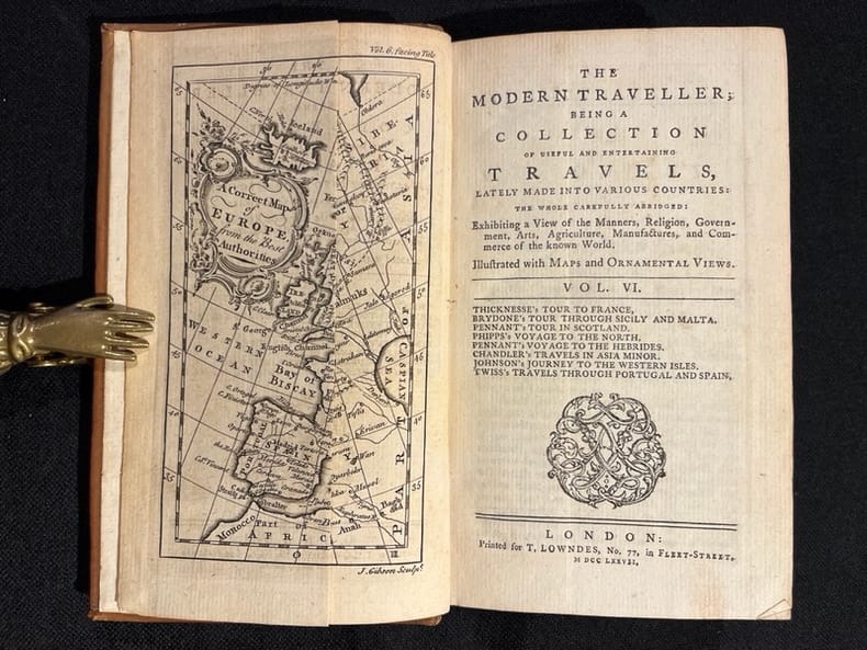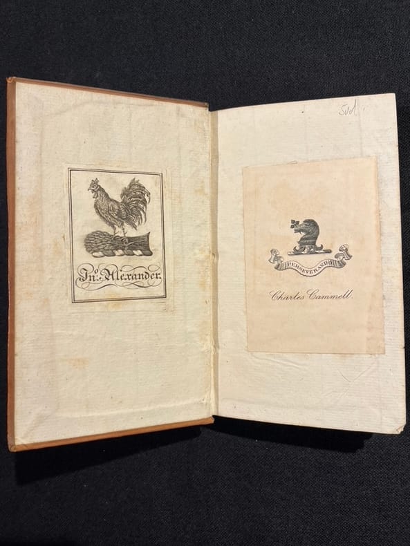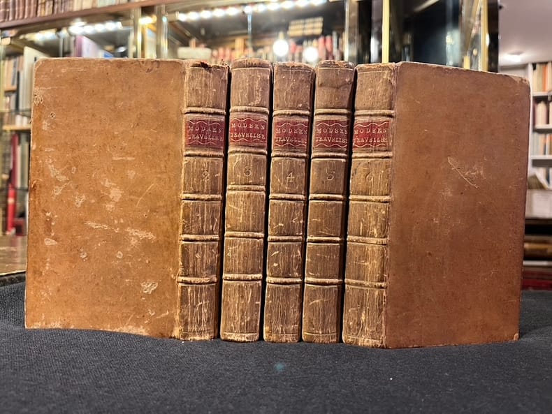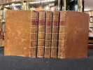 London, Printed for T. Lowndes, 1776-1777. 5 volumes in-12 (sur 6) de [4]-282-[2]; [4]-283; [4]-284; [2]-285-[3] et [2]-287 pages, plein veau blond, dos à 5 petits nerfs ornés de filets, roulettes, tomaison et titre dorés, étiquettes de titre bordeaux, roulette dorée sur les coupes. dos frottés, petit manque à 2 coiffes supérieures, un mors fendu sur 2 cm au vol.4, 2 petits manques de peau au vol. 2, 2 ex-libris par volume.