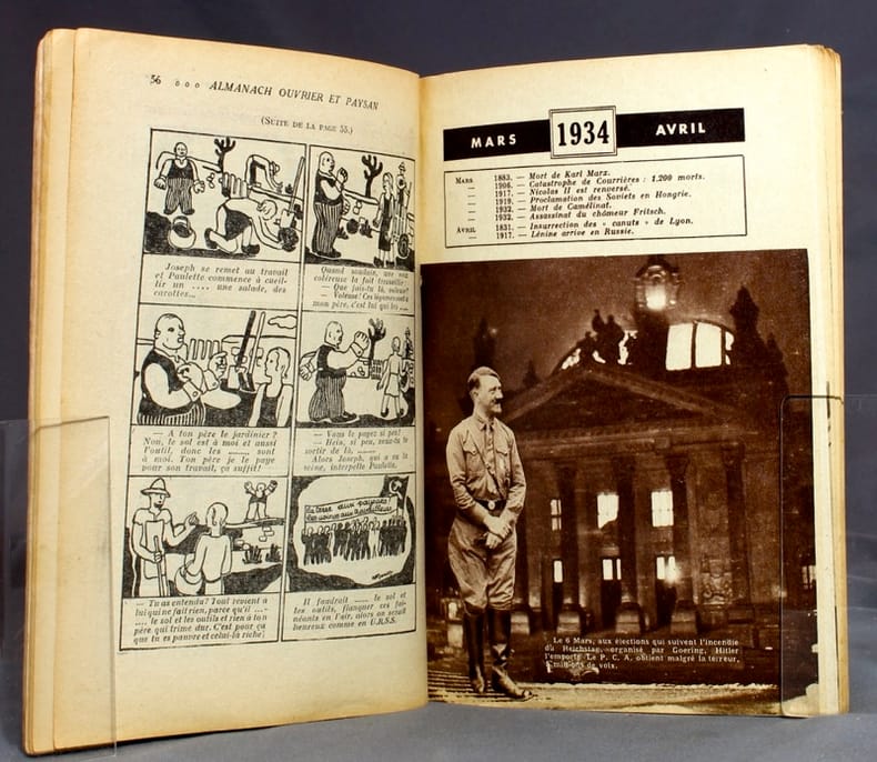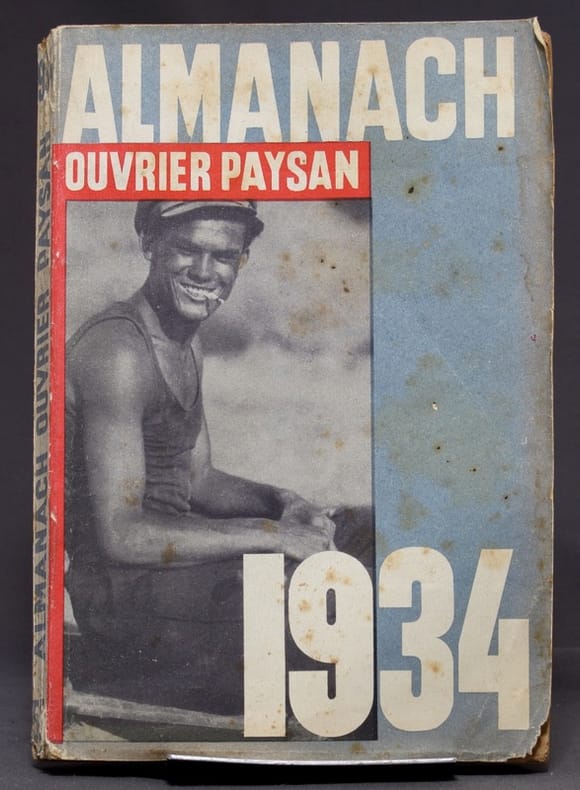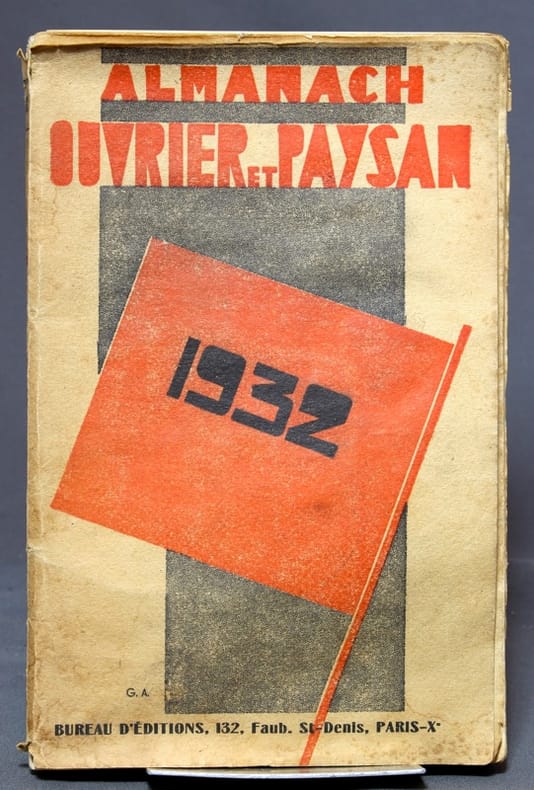 Paris, [L'Humanité - L'Humanité Dimanche] Bureau d'Editions, [1931]. 2 vol. in-8 broché de 352 pages, couverture imprimée en deux tons. La couverture et la première moitié de l'almanach a quelque peu souffert de l'humidité (auréoles et gondolage). 2 feuillets volants pour 1932, et Rousseurs à la couverture, accrocs en tête et en queue, infime manque de papier au premier plat. Auréole au coin inférieurs des premiers feuillets pour 1934.