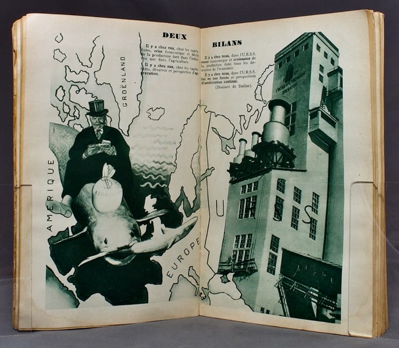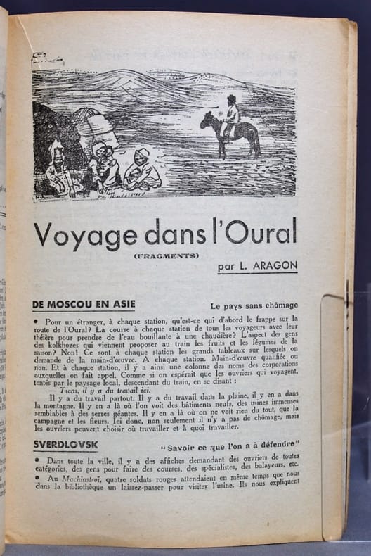 Abondante illustration en noir, sépia et couleurs. "L'Almanach de l'Humanité réclame sa place au modeste foyer de chaque travailleur français, ouvrier et paysan. C'est là son ambition, qu'il prétend justifier par son contenu. Il entreprend de renseigner exactement, d'instruire, de guider ceux et celles pour lesquels une bibliothèque est un luxe inaccessible. Chacun sait que l'almanach fut longtemps, à travers les âges, le seul livre de la famille" [Marcel Cachin, "Partout l'Almanach de l'Humanité", Almanach ouvrier et paysan, 1949, p. 33.]. Chaque mois est introduit par quelques pages de photographies relatant les actualités du mois des années précédentes correspondant. Pas très joyeux... Contient des extraits de textes d'Aragon qui sont les premières publications en français mais déjà parus en russe (De Moscou en Asie - Sverdlovsk - Magnitogorsk - Tcheliabinsk - Zlatoust - Karabach - Nijni-Tagil - Perm [La Société belge des amis d’Aragon - agota.be].