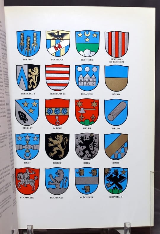 Illustration par André le Comte, soit 53 planches hors-texte d'armoiries en couleurs (certaines un brin jaunies au bord) et de nombreuses figures in-texte en noir. Tirage total à 600 exemplaires numérotés, celui-ci un des 554 sur vélin fin mat des papéteries de la SIHL (87), nominatif, avec une note manuscrit du récipiendaire à ses enfants.
