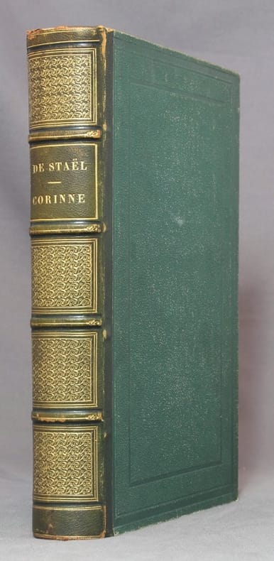 Madame de Staël, écrivain français (Paris 1766-1817) est la fille du banquier Necker, ministre de Louis XVI. Elle brille dans les salons, écrit des nouvelles et des romans. Elle épousa le baron de Staël, ambassadeur de Suède à la cour de France. Corinne ou l'Italie conte l'histoire d'une poétesse, Corinne (Madame de Staël ?), qui inaugure le débat sur la condition féminine, sur le droit de la femme à vivre en être indépendant et à exister en tant qu'écrivain. A l'aube du romantisme ce roman est considéré le symbole de l'amour, un traité d'esthétique et un guide de voyage puisque l'histoire se passe en Italie, en France et en Angleterre. Reliures usés, trou de vers au mors du volume 3.