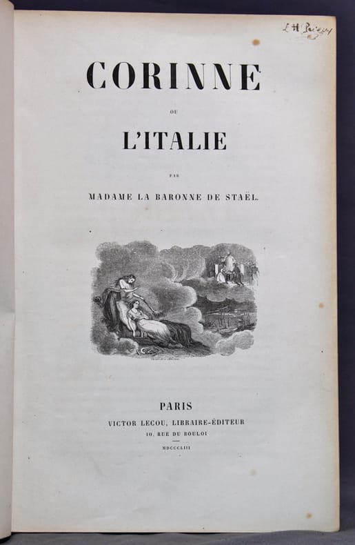 Mme de Staël (1766-1817), femme de lettres française, célèbre autant pour son salon que pour son oeuvre, exerça une profonde influence sur la littérature romantique.” Corinne, ou l'Italie” (1807) fut considéré comme le livre même de l'idéal et de l'amour par les auteurs romantiques.