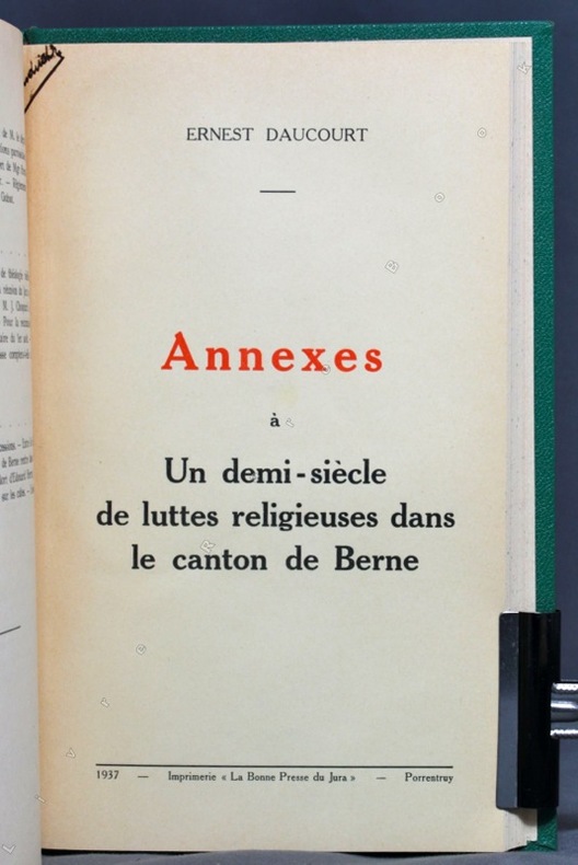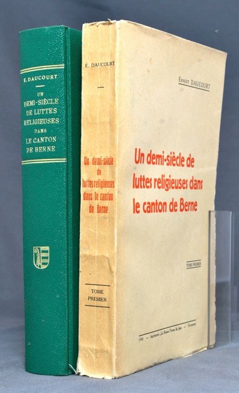 Porrentruy, La bonne presse du Jura, 1936. 2 tomes et le volume d'annexe en 2 volumes in-8, le premier broché de 542 pages, couverture imprimée en deux tons, le second de 484 pages (avec l’annexe 94p.) relié plein skyvertex vert avec titre doré au dos, couverture conservée, tranches mouchetées (tampon de possesseur sur garde).
