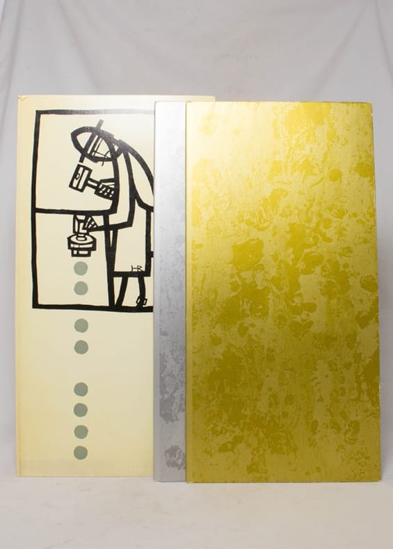 A Lausanne, Au verseau, 1971. 2 volumes in-folio étroits de [4]-XXX-[6] et [24] pages, couvertures muettes marbrées, l'une argentée l'autre dorée, sous étui muet illustré, à compartiment. Etui jauni en bords.