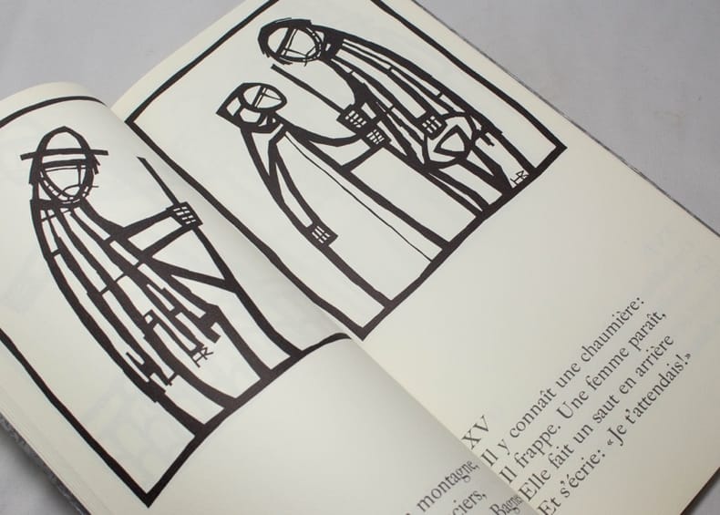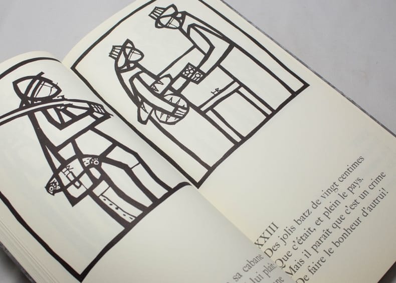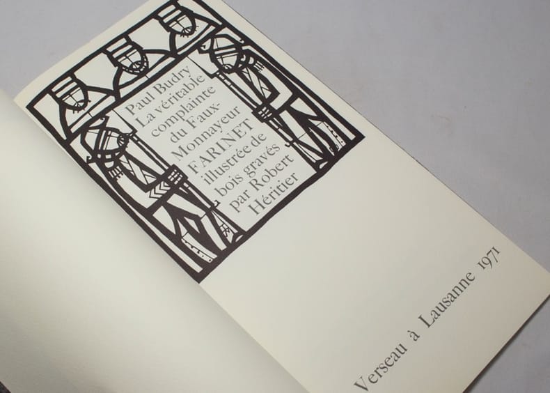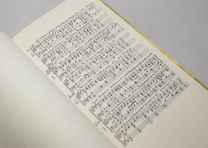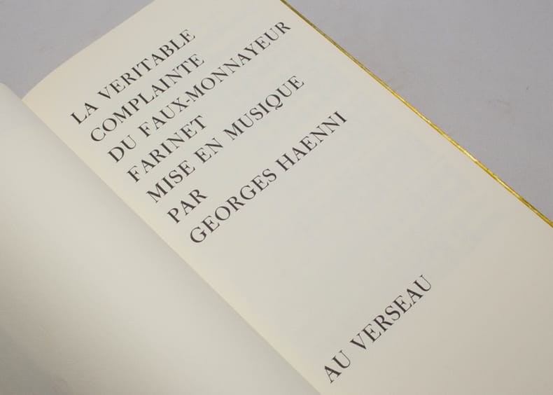 Le premier volume comporte un long poème dont chaque quatrains occupe une page et est illustré d'un bois gravé imprimé en gris de Robert Héritier, à qui l'on doit aussi les images du foulard en soie. Le second volume se compose des partitions en fac-similé autographe de la mise en musique de ce poème par Georges Haenni. Bien rare et bien beau.