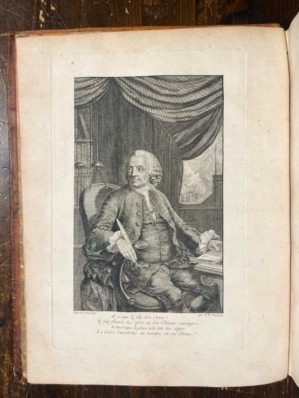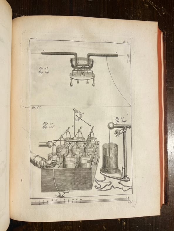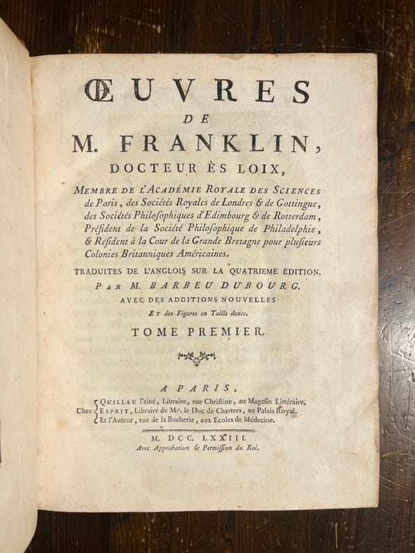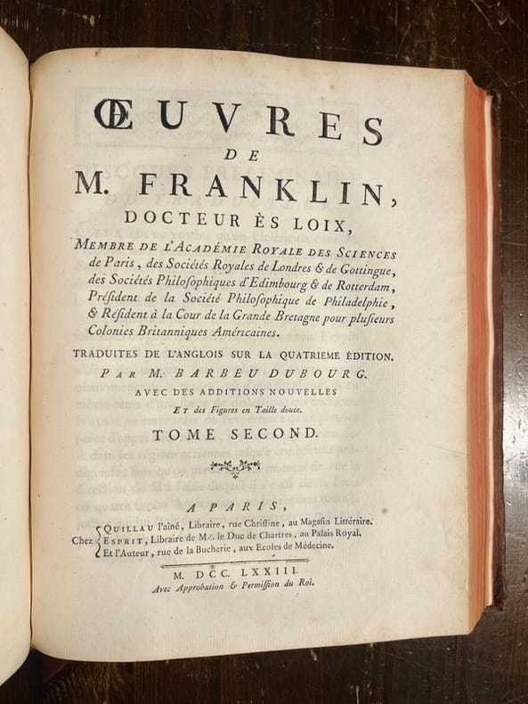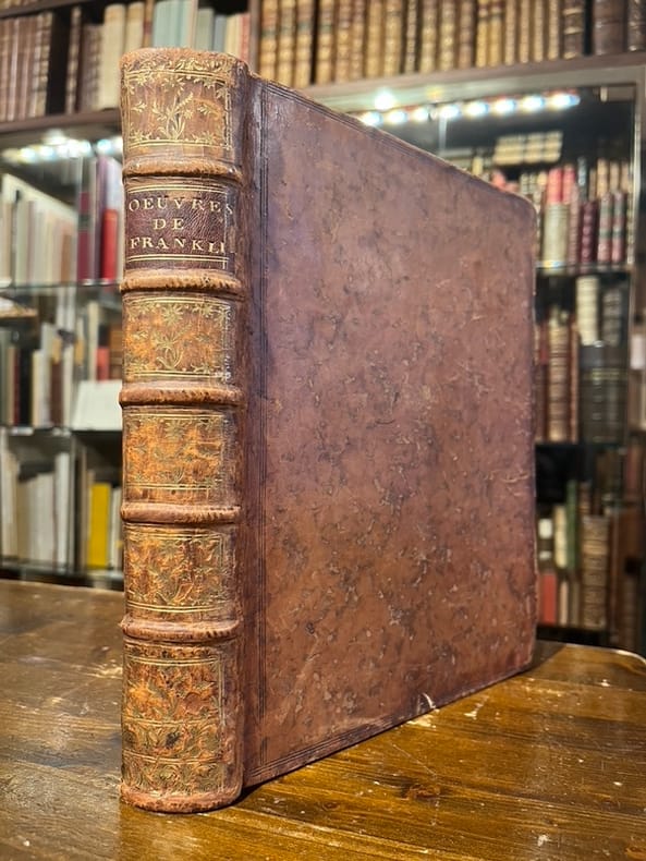 Illustré d'un beau portrait de l'auteur dessiné et gravé par F. N. Martinet, et de 12 planches hors-texte (5 au t. I, 7 au t. II). Édition originale de la traduction française, basée sur la quatrième édition anglaise. Le premier volume est entièrement consacré à l'électricité, le second à divers sujets, tels les trombes, l'inoculation de la vérole, l'évaporation, le son, les carrés magiques, la natation, etc. "The most important scientific book of eighteenth-century America. " in Printing and the Mind of Man.