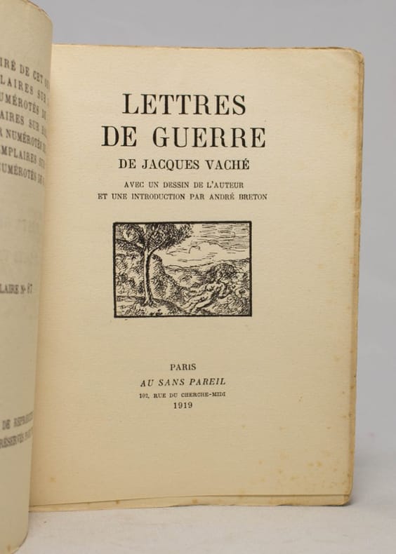 Première édition complète, précédée de quatre préfaces d'André Breton. Nouvelle de Jean-Michel Strogoff, et extraits de presse sur la mort de Jacques Vaché en 1919. Tirage à 2500 exemplaires. Un des 150 PREMIERS exemplaires numérotés sur vélin Crèvecoeur du Marais, contenant hors texte 4 lettres en fac-similé. Couverture illustrée en rouge et bleu brunie. Belle maquette de Pierre Faucheux. Bon 0