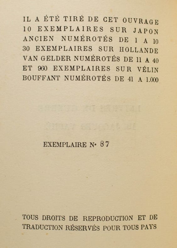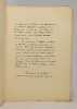 Illustré d'un dessin de l'auteur. Une page en fac-similé autographe. Edition originale au tirage limité à 1000 exemplaires numérotés, celui-ci un des 960 sur vélin bouffant (87). Pâles rousseurs aux feuillets initiaux, mini déchirure au dernier feuillet blanc.
