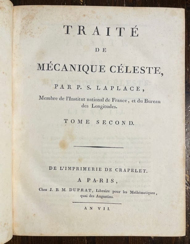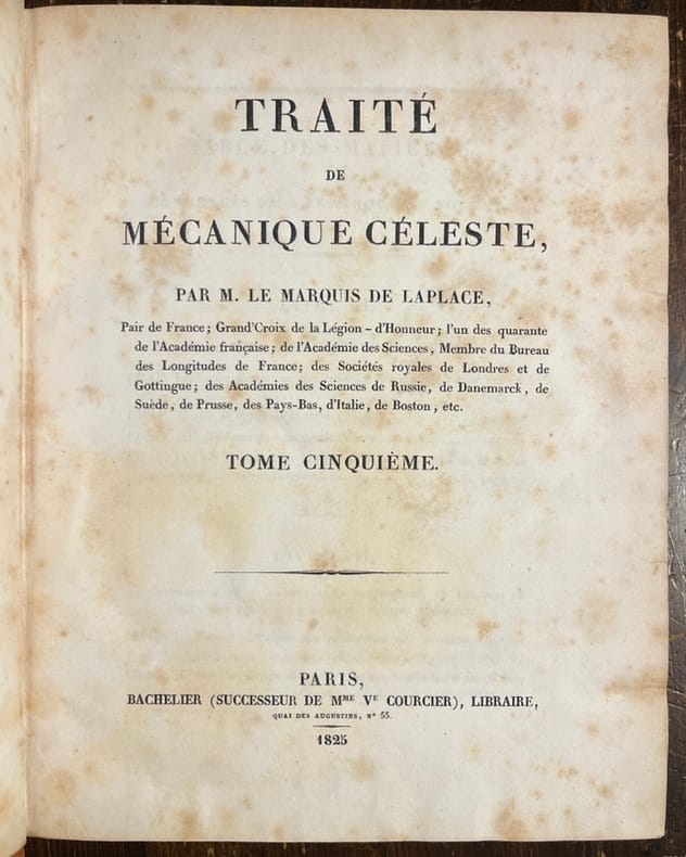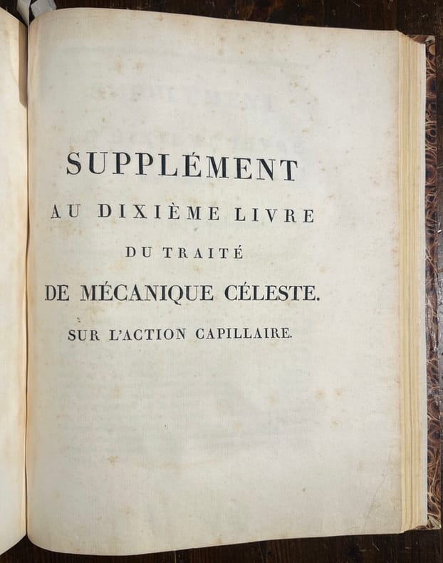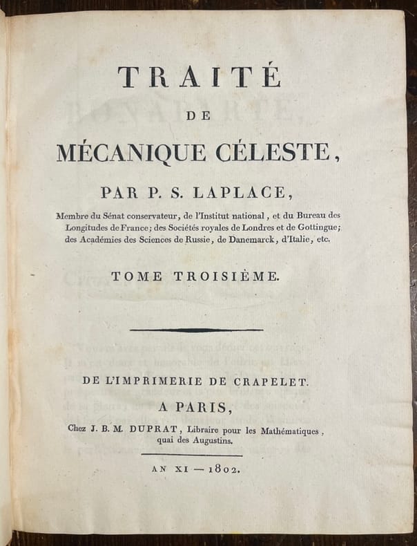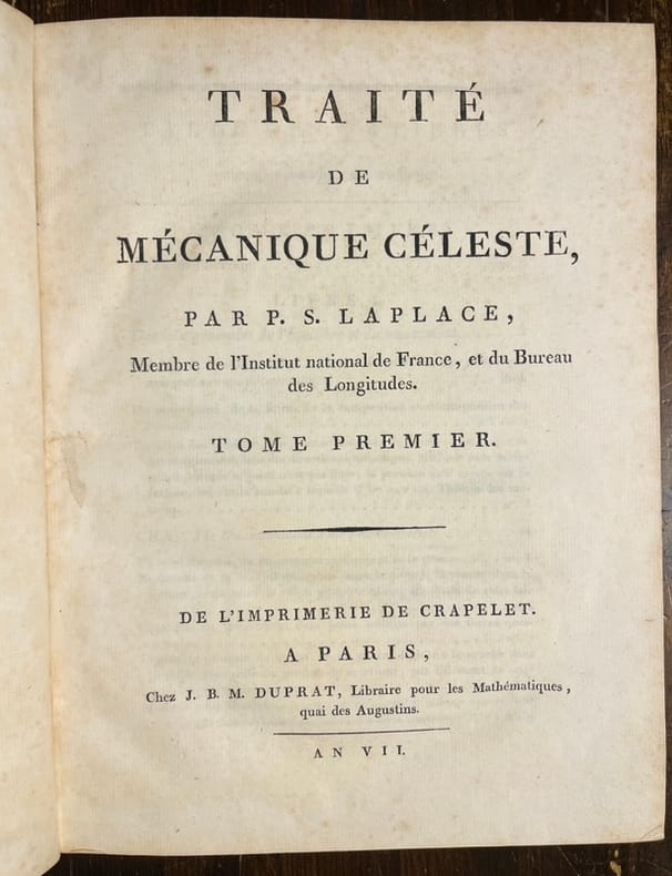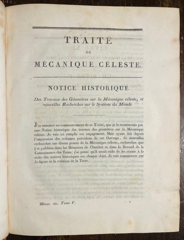 Bien complet de la planche dépliante au tome IV. Édition originale de l'un des ouvrages scientifiques parus les plus importants depuis les "Principia" de Newton. Durant plus d'un siècle il a été la bible de tous les astronomes, et encore aujourd'hui, en dehors des corrections relativistes, les astronomes contemporains utilisent des méthodes qui pour la plupart figurent dans l'ouvrage de Laplace. "Les deux premiers volumes - publiés en 1798 - du "Traité de mécanique céleste" divisé en cinq livres, exposent des rappels de mécanique rationnelle, la loi de la gravitation universelle, la figure des corps célestes, la théorie des marées, les mouvements des corps autours de leur centre de gravité (ainsi que la précession et la nutation). Le troisième volume - 1802 - est divisé en deux livres, le livre VI sur la théorie des mouvements planétaires et le livre VII sur la théorie de la Lune. Le quatrième - 1805 - volume est divisée en trois livres, le livre VIII sur la théorie des satellites de Jupiter, Saturne et Uranus, le livre IX sur les comètes, et le livre X qui traite de la réfraction astronomique et d'autres questions annexes. Le cinquième volume - publié en 1825 - est divisé en six livres essentiellement consacrés à des notices historiques sur des sujets traités dans les quatre premiers volumes, mais y figurent aussi des recherches originales en particuliers sur l'attraction des sphères." En Français dans le texte 201. Bien complet du "Supplément au dixième livre du traité de mécanique céleste. Sur l'action capillaire" et du "Supplément à la théorie de l'action capillaire" avec son propre titre et son faux-titre (1807); mais sans le petit supplément du tome III. Les volumes I et II sont imprimés sur un papier portant, en filigrane, "MECANIQUE CELESTE". Quelques rousseurs, plus prononcées au titre et à la table (uniquement) du volume cinq. Dibner, Heralds of Science, 14. D.S.B., XV, pp. 273-403. Horblit 63. Roberts & Trent, Bibliotheca Mechanica, pp. 197-98. Sparrow, Milestones of Science, 125.