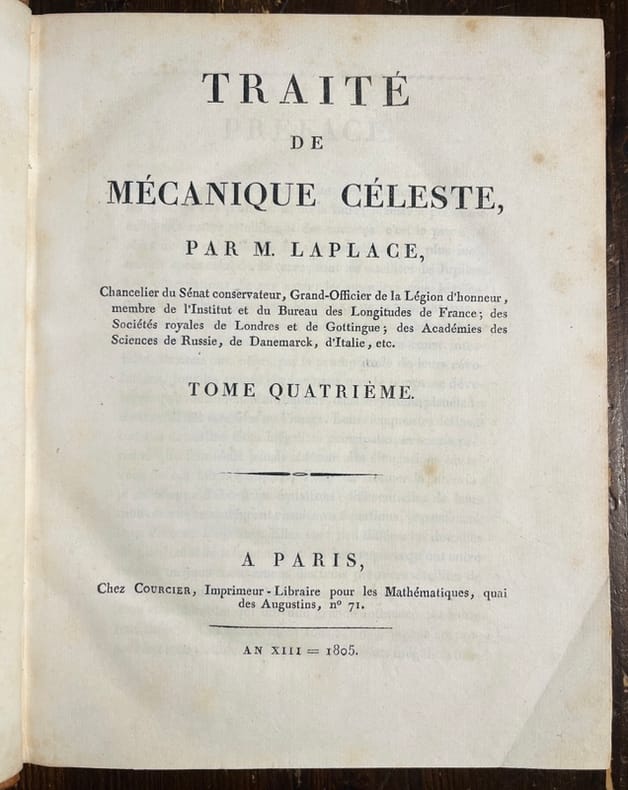 Paris, Duprat, An VII (1799) - An VII - An XIII (1799-1805). Ensemble 5 volumes in-4 (26,2 x 21 cm), veau havane, dos lisse orné, pièces de titre et tomaison maroquin rouge et vert, triple filet à froid d'encadrement sur les plats, tranches mouchetées (reliure de l'époque). Ouvrage complet du supplément (65 pp.) du Xe Livre du Traité de mécanique céleste, avec une planche dépliante, mais sans le supplément au 3e volume (24 pp.). Un 5e volume (absent ici) contenant les Livres XI, XII, XIII, XIV et XV, a été publié en 4 parties, de 1823 à 1825 (Brunet). "Traité d'astronomie, puisque M. de La Place en donnera l'ampleur dans la Mécanique céleste, l'Exposition du système du monde est déterminant quant à l'avènement définitif des mathématiques dans le champ de l'astronomie, de La Place y démontre surtout sa position philosophique, celle d'un déterminisme absolu". Bon exemplaire, malgré quelques défauts d'usage.