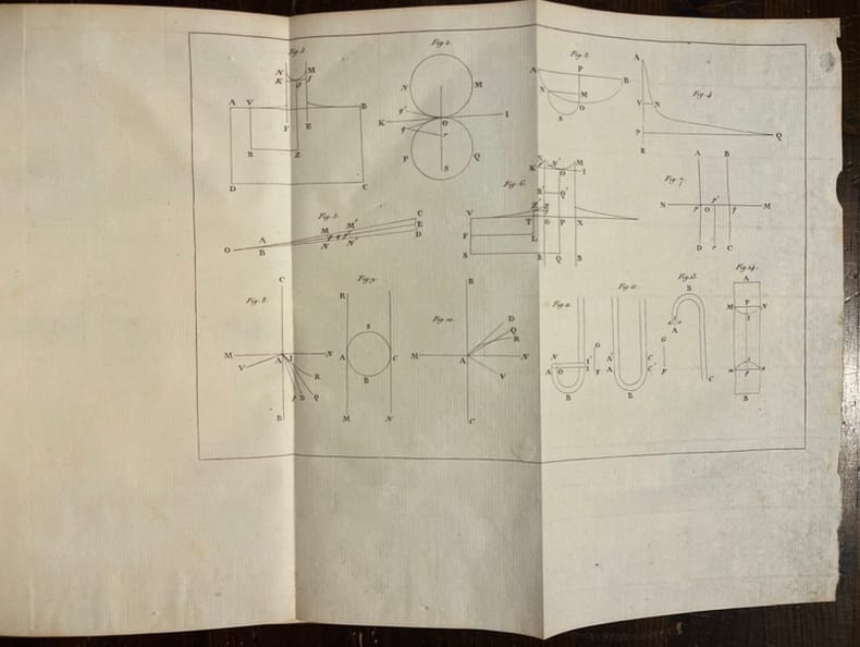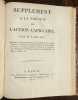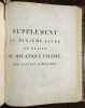 Paris, J.B.M. Duprat; Bachelier, 1798-1805. 4 volumes relié en deux tomes in-4 demi-vélin de XXXII-368; [4]-382 et XXIV-304; 24; 40-347-[1]; [2]-65-[1]; 78-[2] pages, dos lisses, étiquette de titre brune. Reliure XIXe. Collation: vol. 1: a-d4; A-Z4; Aa-Zz4. vol. 2: []2; A-Z4; Aa-Zz4; Aaa4; Bbb3 (le feuillet Bbb4 semble être un feuillet blanc). vol. 3: a-c4; A-Z4; Aa-Pp4. suppl. 1: A-C4. vol. 4: a-e4; A-Z4; Aa-Vv4; Xx2. suppl. 2: []1; AH4; I2 (le second feuillet est la planche dépliante). suppl. 3: A-K4.